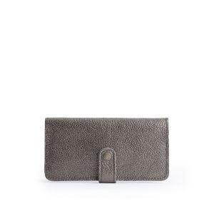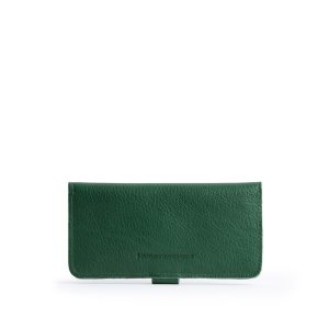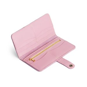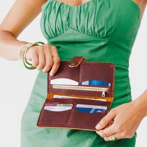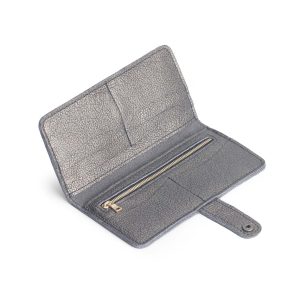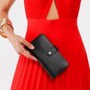 - Features a secure snap closure with 8 card slots and a zippered interior pocket